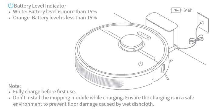The Dreame D9 is powered by a built-in high-performance Li-Po rechargeable battery pack. In order to maintain battery performance, please keep the robot charged for daily use.