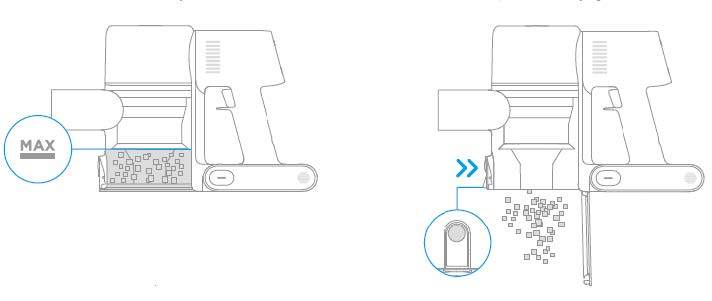 The vacuum cleaner’s cleaning ability will be reduced if the dust compartment is filled to the “MAX” mark. To regain performance, empty the dust compartment in a timely manner. Before emptying the compartment, make sure the vacuum cleaner is disconnected from the power, and do not press its power button. Press the dust compartment bottom cover release button, then empty the contents.