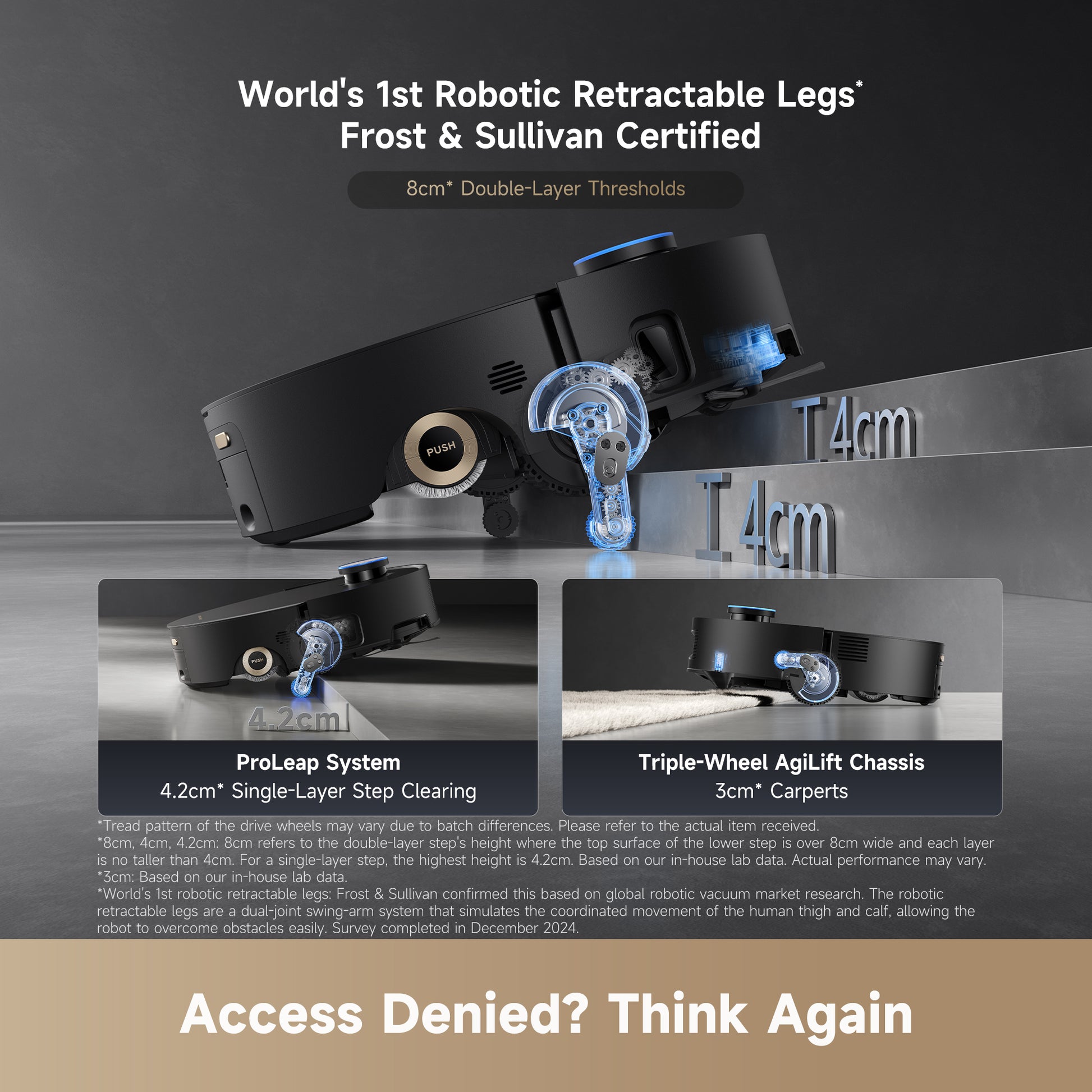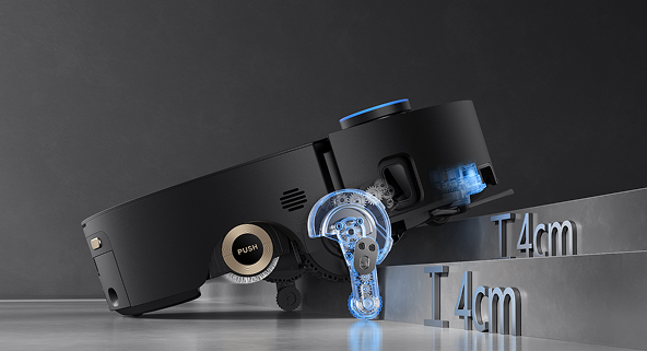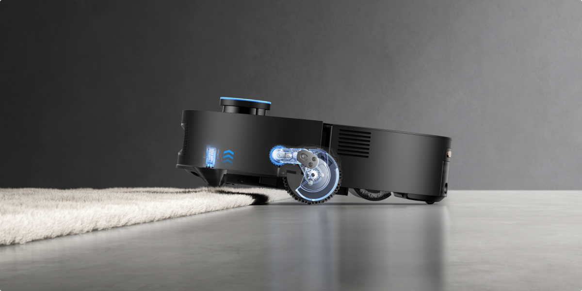 Triple-Wheel AgiLift™ chassis clears carpets with ease via adaptive lifting, utilizing a three-wheel system that tailors strategies for various obstacles.